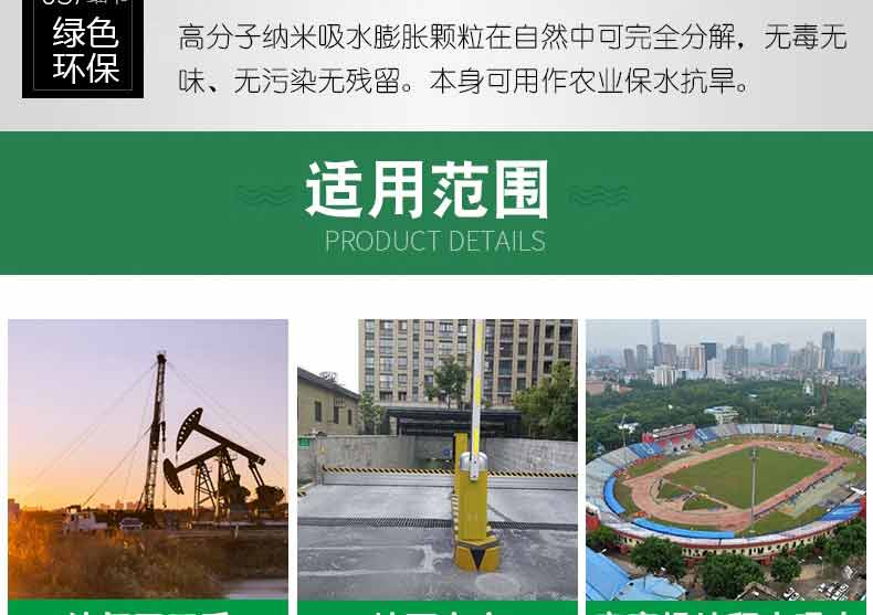 采用以水治水的新理念:在防汛搶險(xiǎn)緊急時(shí)刻無處尋找砂石土料,可以將吸水膨脹袋放入水中,3分鐘可迅速膨脹到20-25公斤,代替人工裝沙填土的防汛沙袋時(shí)代,也可以直接將吸水膨脹袋投放到管涌口,快速封堵堤壩管涌,廣泛用于防洪搶險(xiǎn),堤壩管涌,河堤堵漏,堤防漏洞、漫溢搶護(hù),防洪堤防的臨時(shí)性加高,臨時(shí)性防水圍城的構(gòu)筑,水庫,江河大堤滲水滑坡,護(hù)坡防沖,工程截流,暗溝和暗洞的堵塞。用于庫房,庭院,溝塘,被淹耕地排水;用于容易淹水的工廠,隧道,地下停車場(chǎng),地鐵等領(lǐng)域作為防落水的使用;用于市政設(shè)施、道路施工,工地橋梁建設(shè),競(jìng)賽場(chǎng)地等積水處吸水去水。是我國各地水利,水務(wù),防汛辦,防汛物資儲(chǔ)備及市政排水,和城市易澇區(qū)必備的應(yīng)急防汛儲(chǔ)備物資。