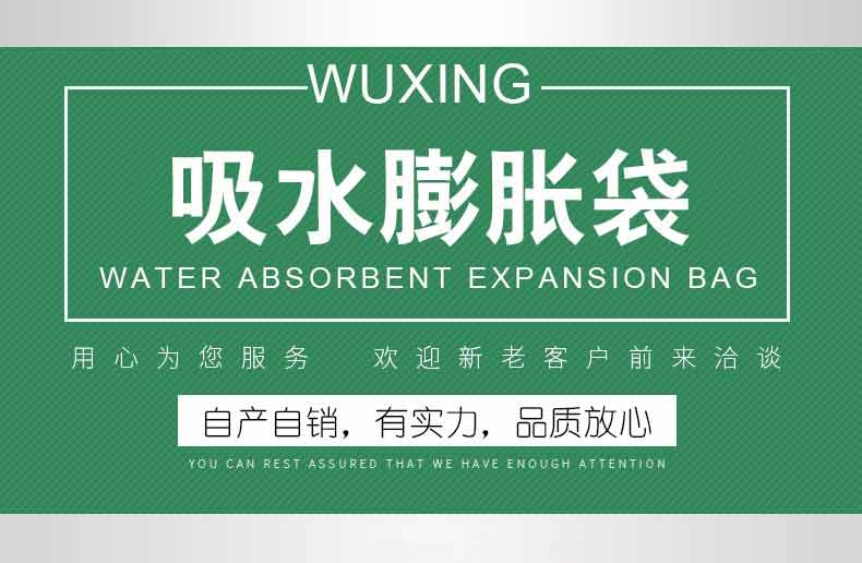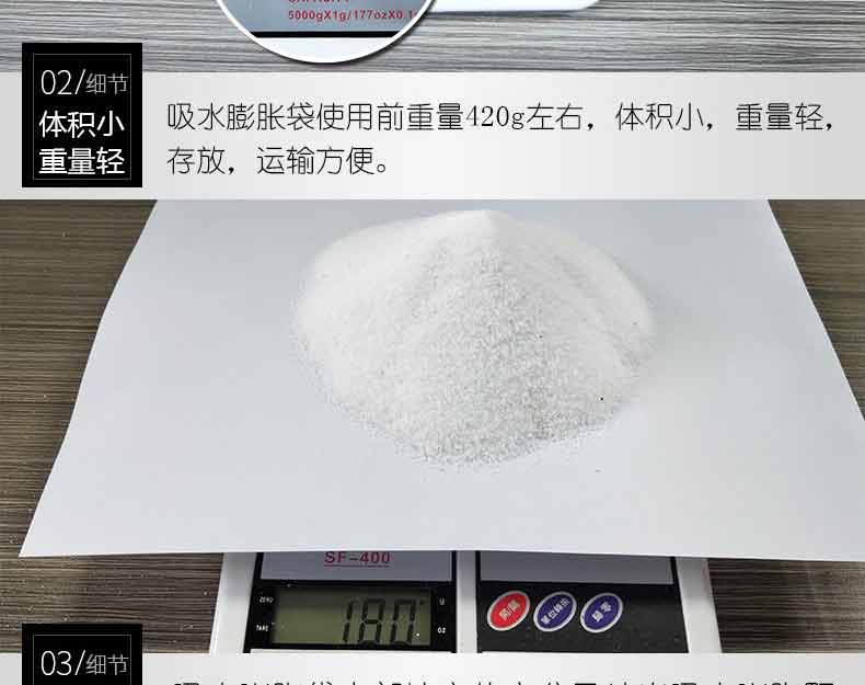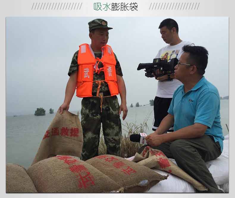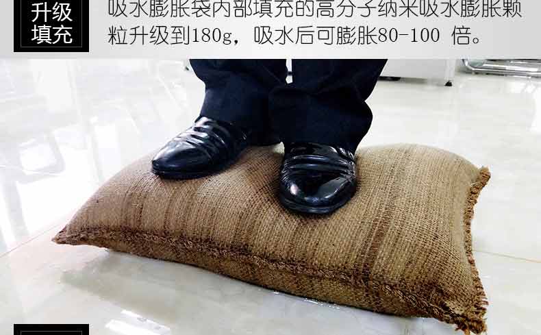 以水治水,快速膨脹,管涌以及快速構(gòu)筑擋水壩,封堵缺口,替代沙袋,替代沙袋和編織袋。操作簡(jiǎn)單,攜帶運(yùn)輸方便,遇水膨脹速度快,浸入水中 3 分鐘即可迅速膨脹至 18 ~ 20 千克,吸水膨脹袋 經(jīng)現(xiàn)場(chǎng)測(cè)試比沙土包堵截速度快9倍,使用時(shí)只需一人就可以完成,勞動(dòng)強(qiáng)度大為減輕,無毒,無害,無味,無污染,可自然降解