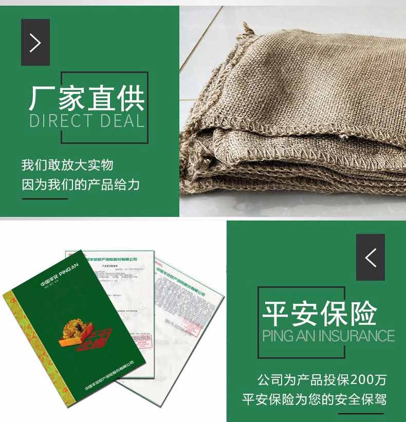 吸水膨脹袋內(nèi)裝的是新型的高分子納米吸水物質(zhì),這種物質(zhì)無毒、無味、無污染,吸水膨脹前為極小的顆粒物質(zhì),吸水后為黑豆大小的含水物質(zhì),干凈且無公害,待高分子吸水物質(zhì)使用后可用于農(nóng)業(yè)保水抗旱,所以在洪水過后可就地將袋內(nèi)的物質(zhì)傾倒入農(nóng)田中,在泥土中可完全分解,是綠色環(huán)保、一舉兩得的首選產(chǎn)品。外袋為純麻布和棉布織成,遇水后麻繩可更加結(jié)實(shí)耐磨。