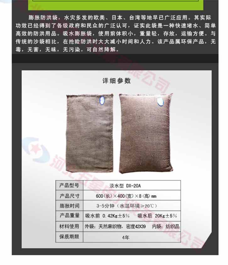 膨脹防洪袋,使用前體積小,重量輕,存放,運(yùn)輸方便。與傳統(tǒng)的沙袋相比,在搶險(xiǎn)防洪時(shí)大大減小時(shí)間和人力,另防洪搶險(xiǎn)更有效率。吸水膨脹袋屬環(huán)保產(chǎn)品,無(wú)毒,無(wú)害,無(wú)味,無(wú)污染??勺匀唤到?。