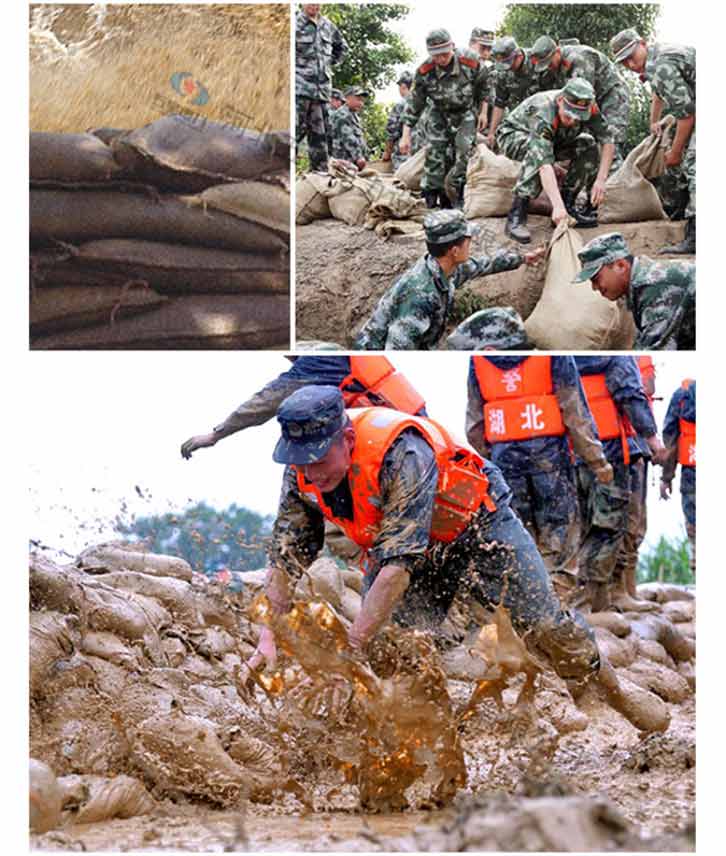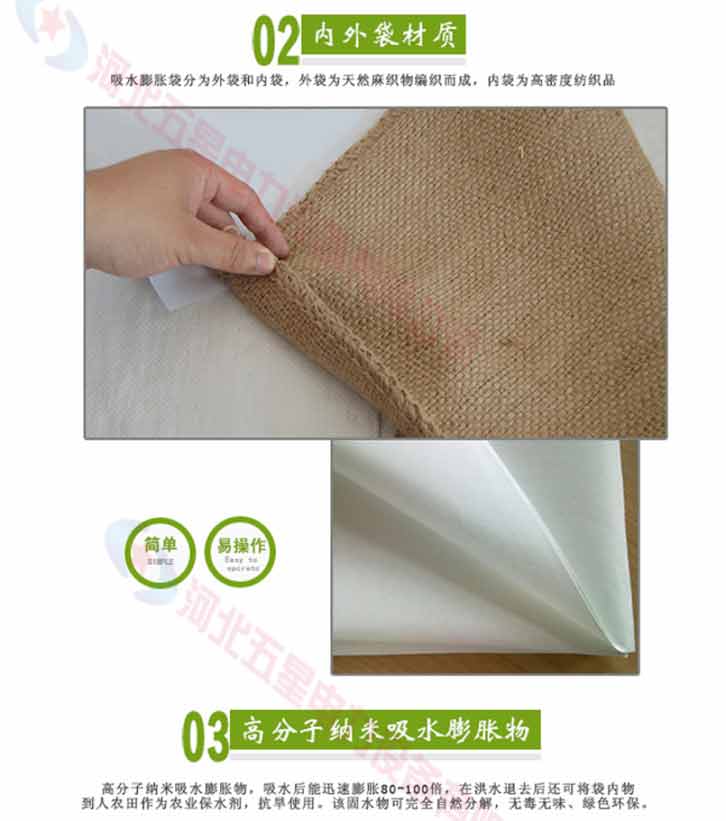 吸水膨脹袋內(nèi)裝的是新型的高分子納米吸水物質(zhì),這種物質(zhì)無(wú)毒、無(wú)味、無(wú)污染,吸水膨脹前為極小的顆粒物質(zhì),吸水后為黑豆大小的含水物質(zhì),干凈且無(wú)公害,待高分子吸水物質(zhì)使用后可用于農(nóng)業(yè)保水抗旱,所以在洪水過(guò)后可就地將袋內(nèi)的物質(zhì)傾倒入農(nóng)田中,在泥土中可完全分解,是綠色環(huán)保、一舉兩得的首選產(chǎn)品。外袋為純麻布和棉布織成,遇水后麻繩可更加結(jié)實(shí)耐磨。