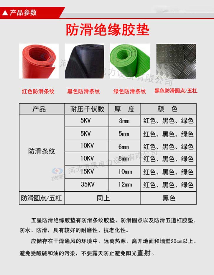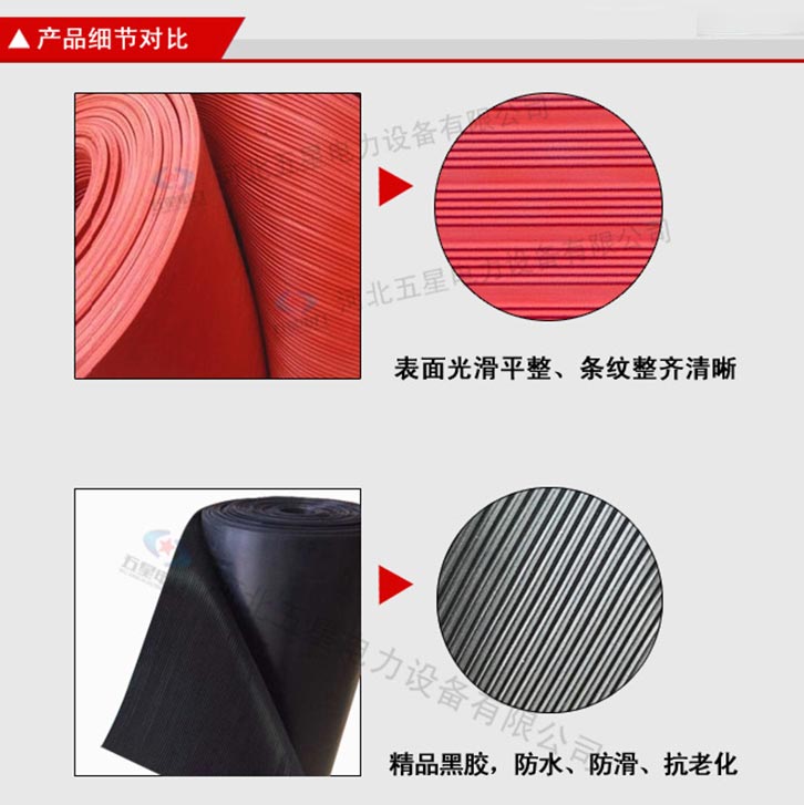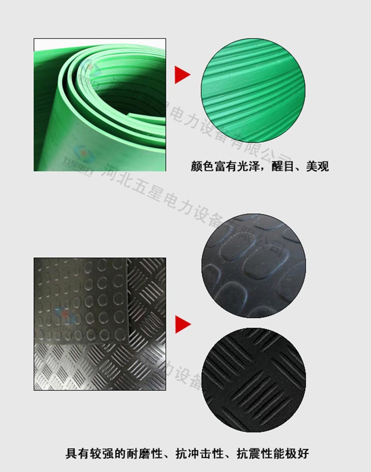 防滑絕緣膠墊產(chǎn)品分為防滑圓點(diǎn)、防滑條紋。 不含雜質(zhì):原生橡膠材質(zhì),不含次生膠,切面不會(huì)有粉末, 柔韌性好:具有優(yōu)良的絕緣性能,彈性強(qiáng),拉伸強(qiáng)度大 光澤度高:原生橡膠材質(zhì),無任何塑料成分,表面光澤度高 無氣泡:五星電力絕緣膠墊,表面無氣泡,無裂痕
