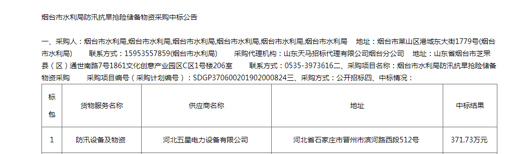 熱烈祝賀河北五星煙臺市水利局防汛抗旱搶險(xiǎn)儲備物資采購一舉中標(biāo)!